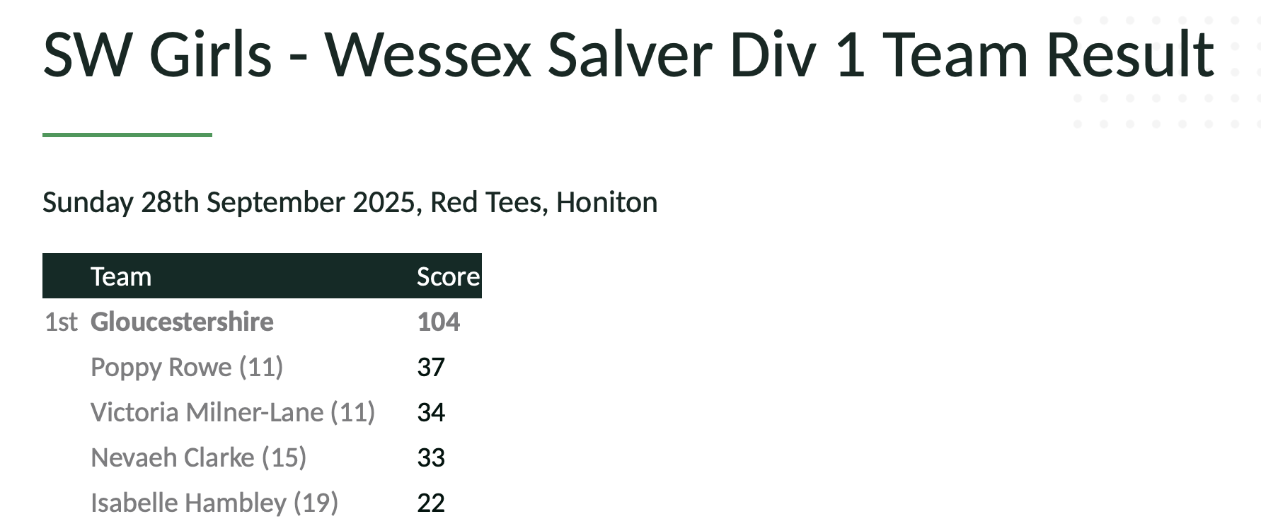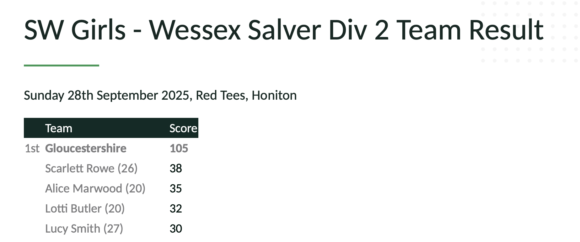 On a bright Sunday in Honiton, and spurred on by Team Europe who were going into battle a little later, Gloucestershire's 'Little Spots' won the Wessex Salver trophy by 14 points. With 6 out of 8 scores to count in the stableford format, the girls played beautifully and with determination to win on a well maintained course.